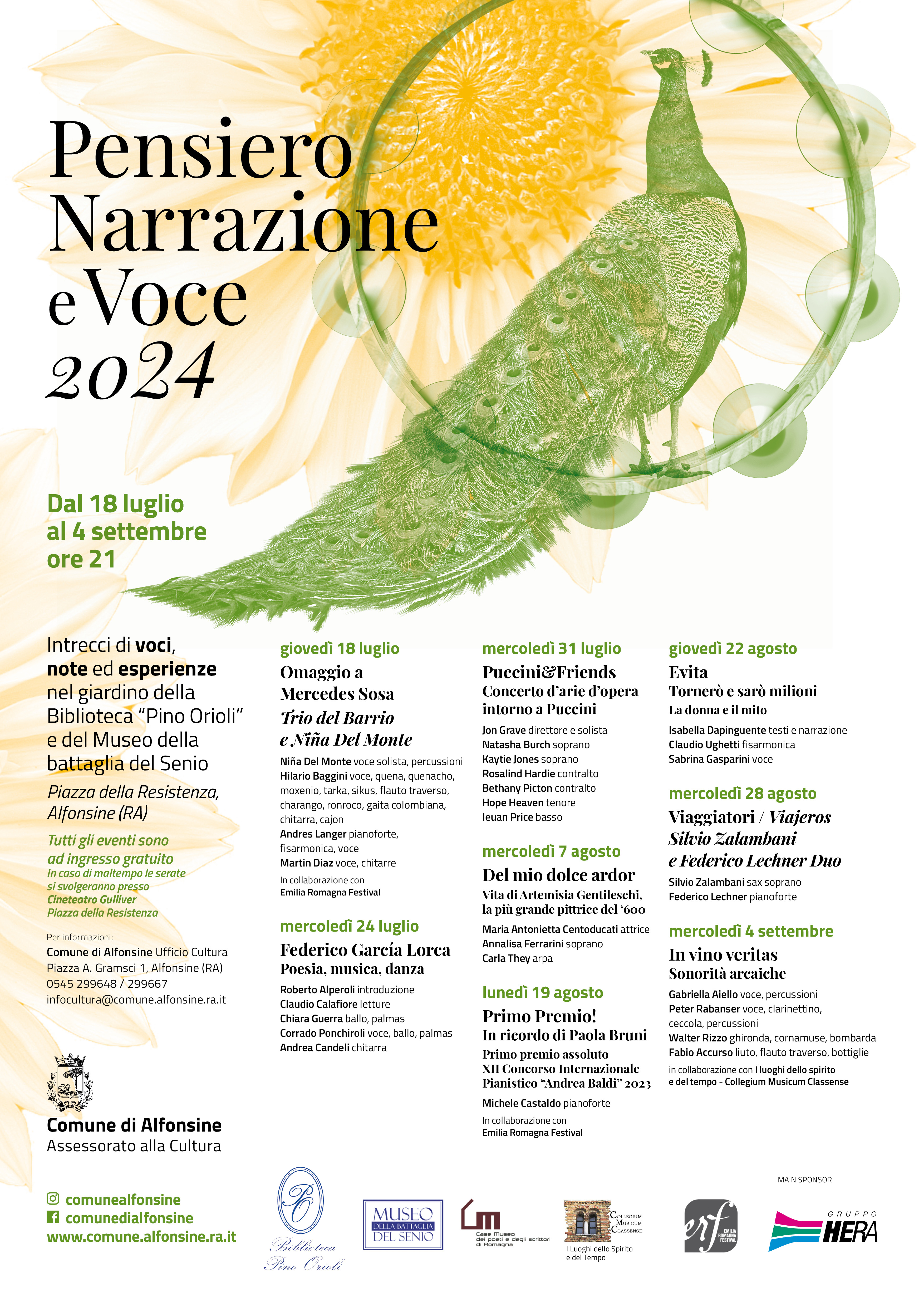 La rassegna aprirà giovedì 18 luglio con un omaggio a Mercedes Sosa, un itinerario attraverso la ricchezza dei ritmi sudamericani in collaborazione con Emilia Romagna Festival; seguirà mercoledì 24 luglio uno spettacolo dedicato al celebre poeta, drammaturgo e regista teatrale spagnolo Federico García Lorca. Mercoledì 31 luglio sarà la volta di Puccini & friends, un concerto d’arie d’opera che rende omaggio al grande compositore nel centenario della sua morte.