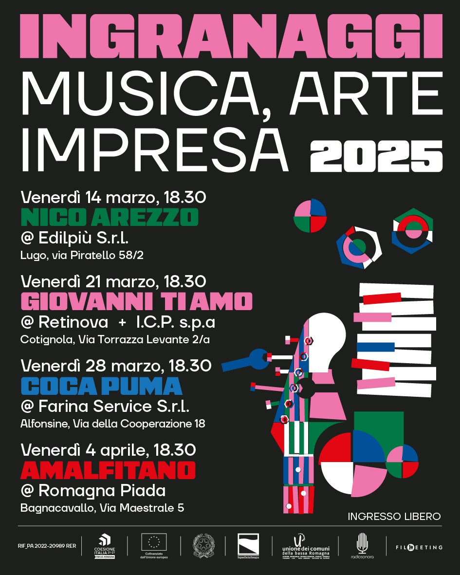L’undicesima edizione di «Ingranaggi» partirà venerdì 21 marzo con Giovanni ti amo, che si esibirà presso Retinova + ICP a Cotignola, in via Torrazza Levante 2/a. Venerdì 28 marzo alla Farina Service di Alfonsine, in via della Cooperazione 18, suonerà Coca Puma, mentre venerdì 4 aprile presso Romagna Piada, a Bagnacavallo in via Maestrale 5, si esibirà Amalfitano. Tutti gli appuntamenti partono alle 18.30.