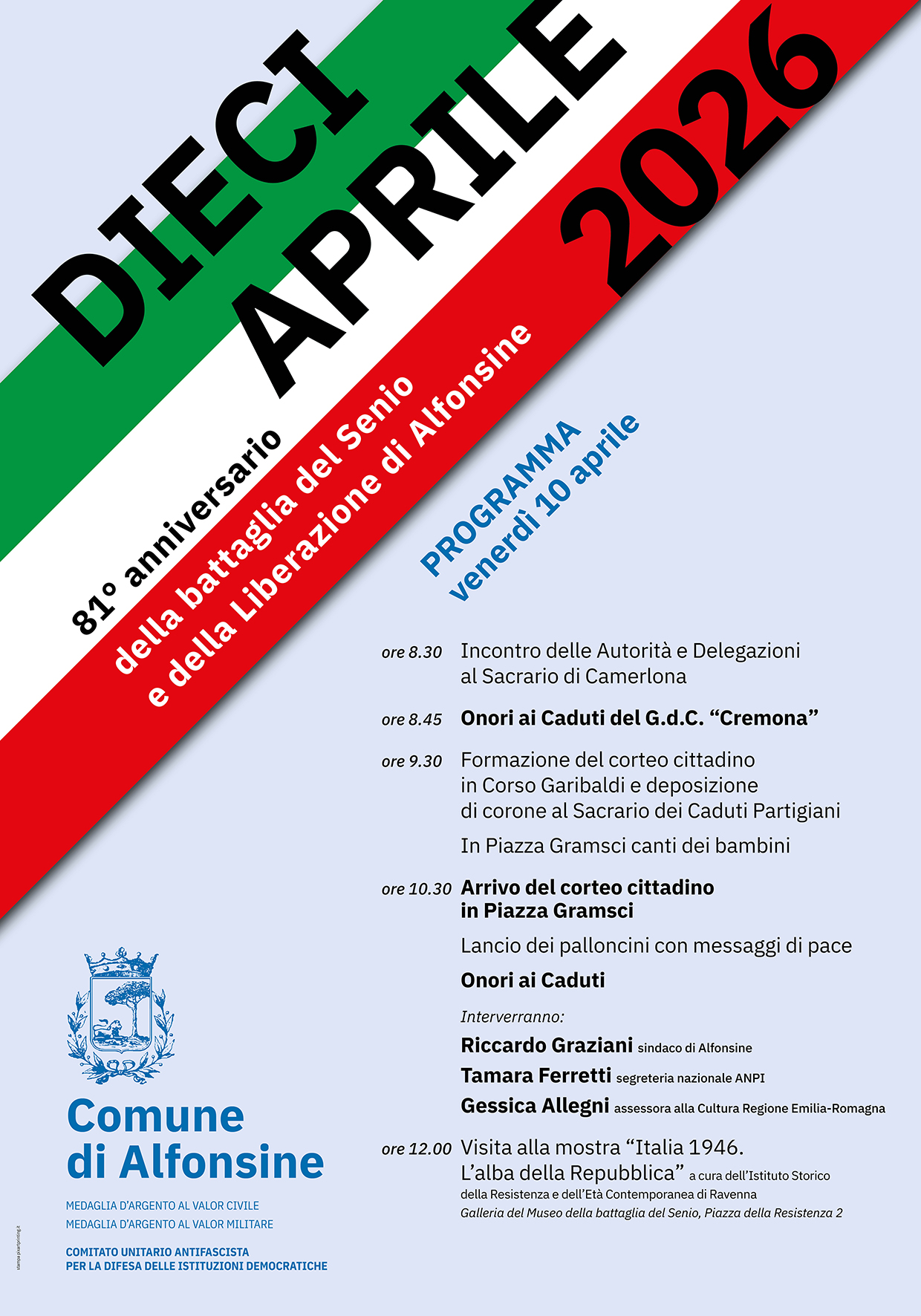Venerdì 10 aprile 2026 ad Alfonsine ricorre l'81° anniversario della Liberazione dall’occupazione nazifascista e della nascita delle Istituzioni democratiche.